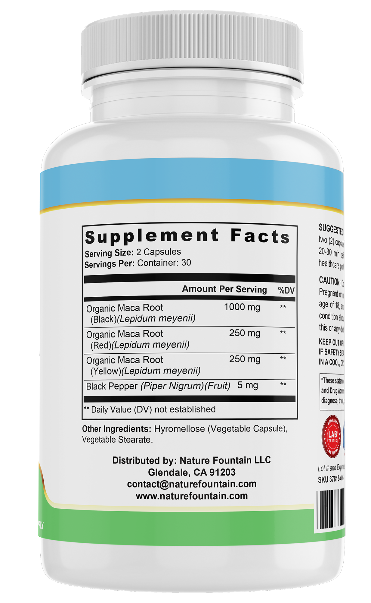 Maca has being used since very old times, due to its popularity in the Peruvian Andes and then around the world for male infertility, health problems after menopause, increasing arousal in healthy people, and other purposes. Vegan ingredients.